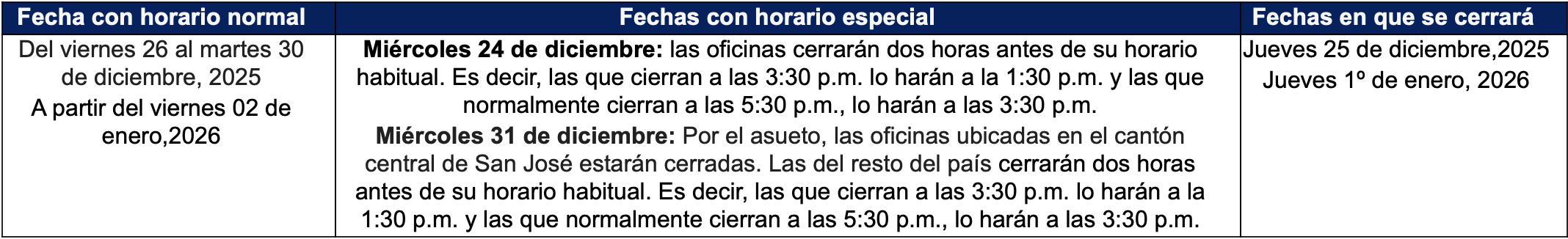 El Banco de Costa Rica informa que para este fin y principio de año sus oficinas a nivel nacional tendrán los siguientes horarios:
