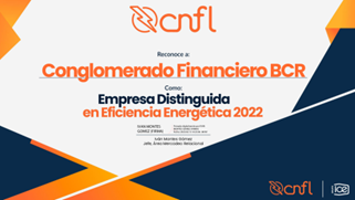 En el Conglomerado Financiero BCR (CFBCR) celebramos las buenas prácticas que hemos logrado adoptar en forma sostenible y que nos ha merecido por segundo año consecutivo el reconocimiento como Empresa Distinguida en Eficiencia Energética 2022, otorgado por la Compañía Nacional de Fuerza y Luz (CNFL).